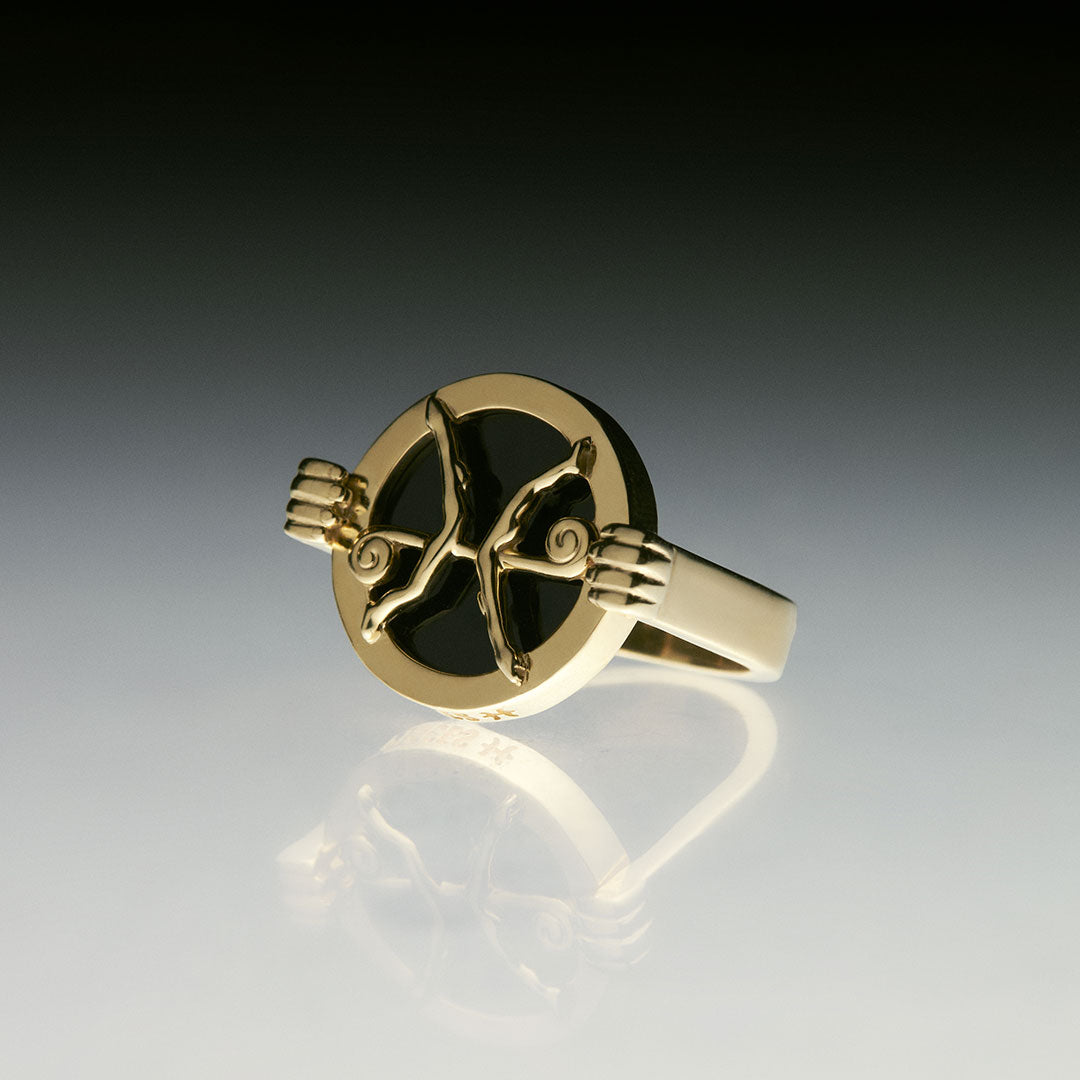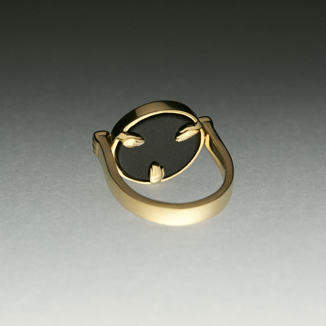 No avesso da peça, três mãos formam um triângulo, símbolo da geometria sagrada e do equilíbrio entre corpo, espírito e universo. Confeccionado em prata 925, com opção em prata 925 com banho de ouro 18k, o anel traz ágata negra, pedra associada à proteção e à força interior.