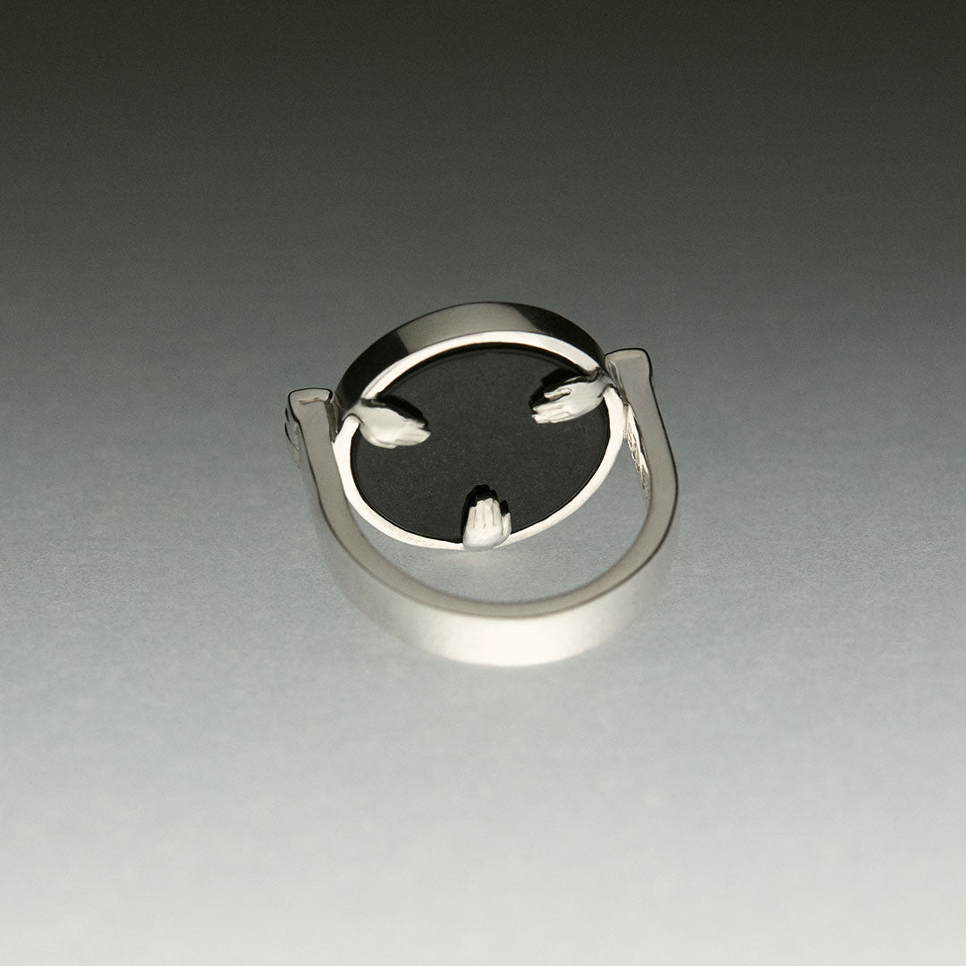 No avesso da peça, três mãos formam um triângulo, símbolo da geometria sagrada e do equilíbrio entre corpo, espírito e universo. Confeccionado em prata 925, com opção em prata 925 com banho de ouro 18k, o anel traz ágata negra, pedra associada à proteção e à força interior.