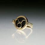 No avesso da peça, três mãos formam um triângulo, símbolo da geometria sagrada e do equilíbrio entre corpo, espírito e universo. Confeccionado em prata 925, com opção em prata 925 com banho de ouro 18k, o anel traz ágata negra, pedra associada à proteção e à força interior.