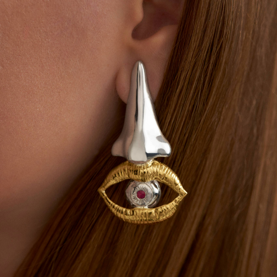 A Joia Paola Vilas brinco Andaluz é uma escultura surrealista vestível em formato de olhos e bocas em prata 925 ou prata com banho de ouro 18k e pedra de rubi natural. Uma de nossas joias icônicas.