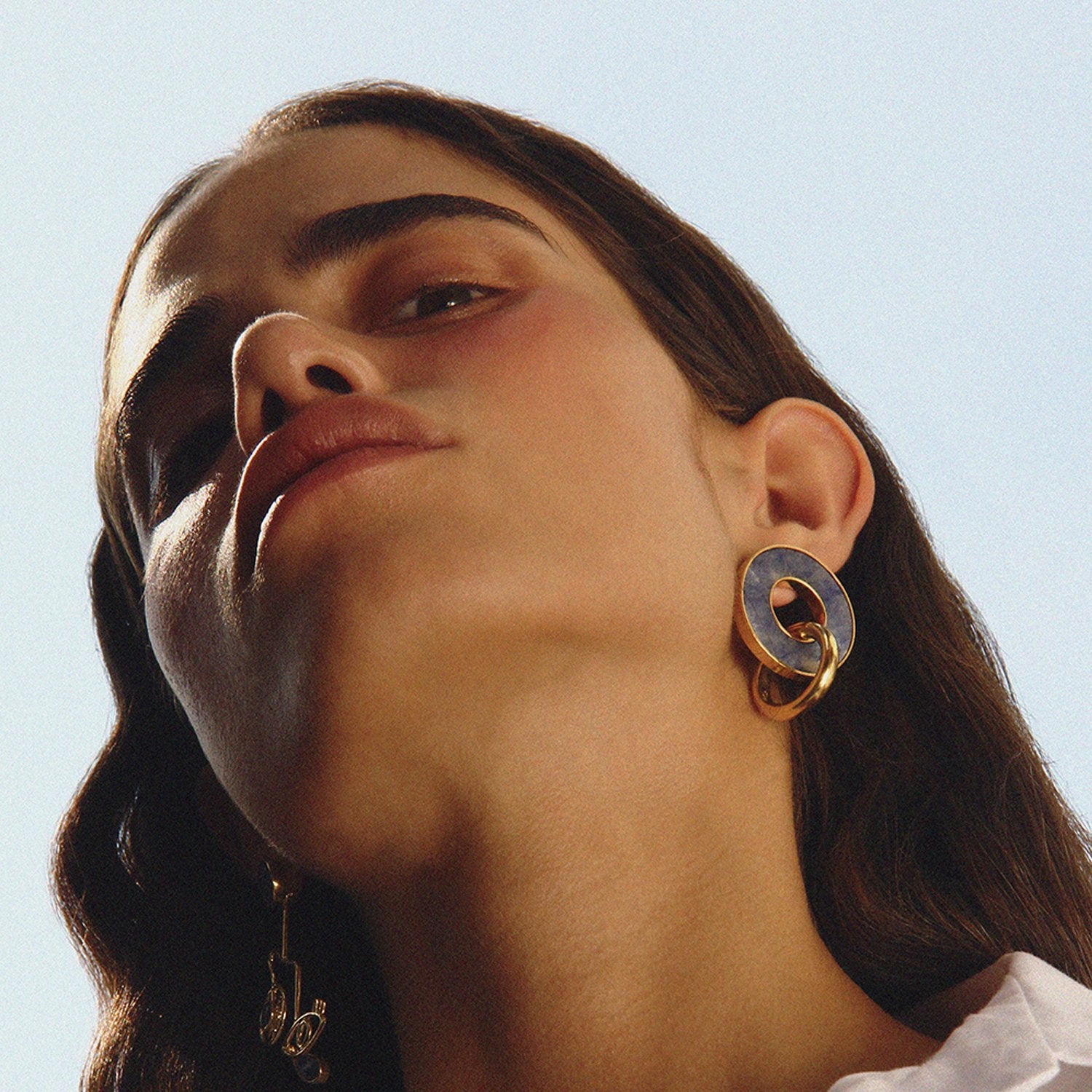 Material: Brinco Constantin disponível em Prata 925 com banho em Ouro 18k. Nas gems: Amazonita, Sodalita ou Granito.