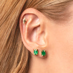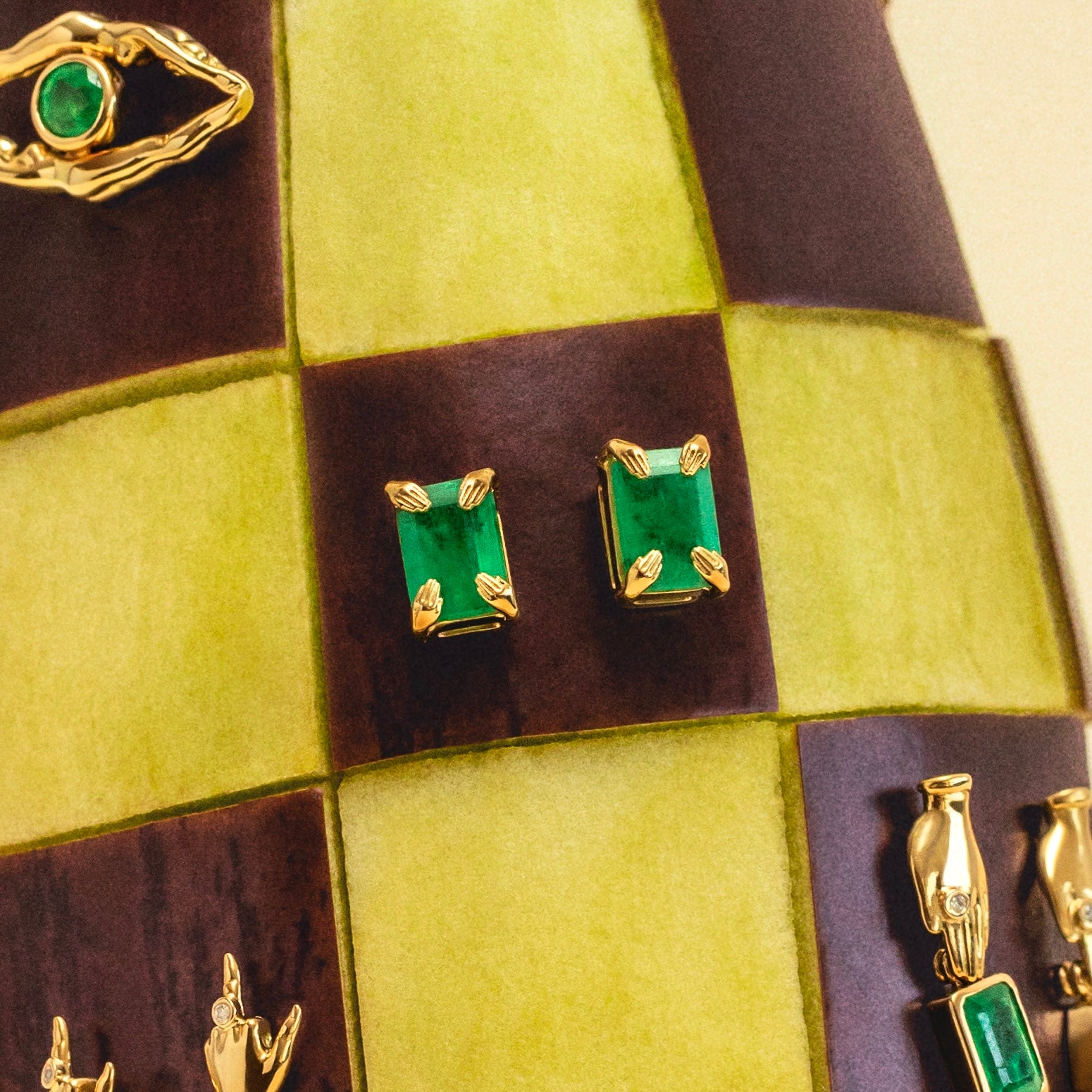 Olhe mais de perto, e você descobrirá que as garras que seguram essas esmeraldas não são simples fixações metálicas, mas sim esculturas de mãos delicadas. As mãos, habilmente esculpidas em ouro 18k, tornaram-se uma característica única das criações de Paola Vilas, que as posiciona em um ato de mergulho, sobre preciosas gemas, criando uma narrativa surreal e mágica em cada detalhe.