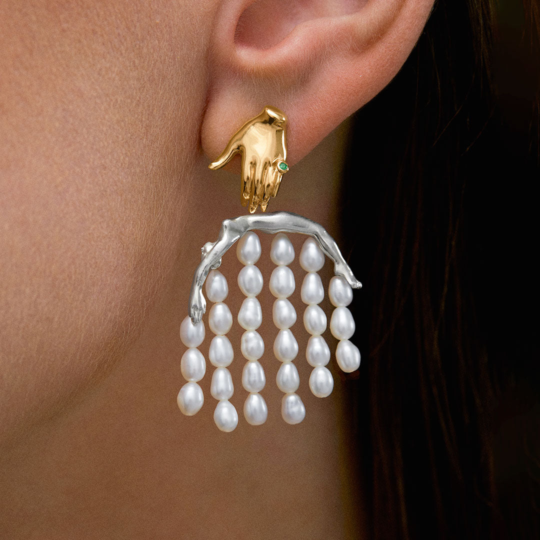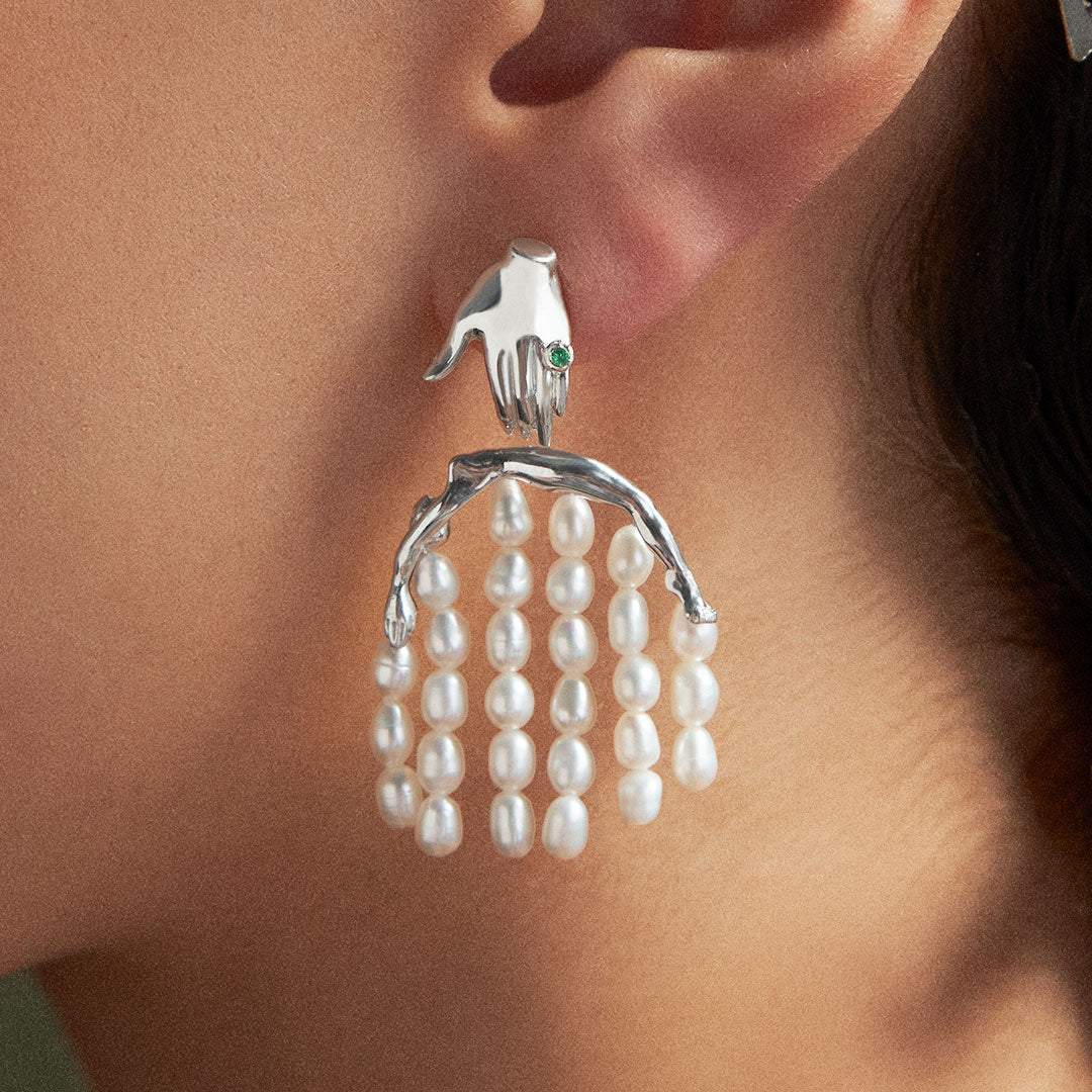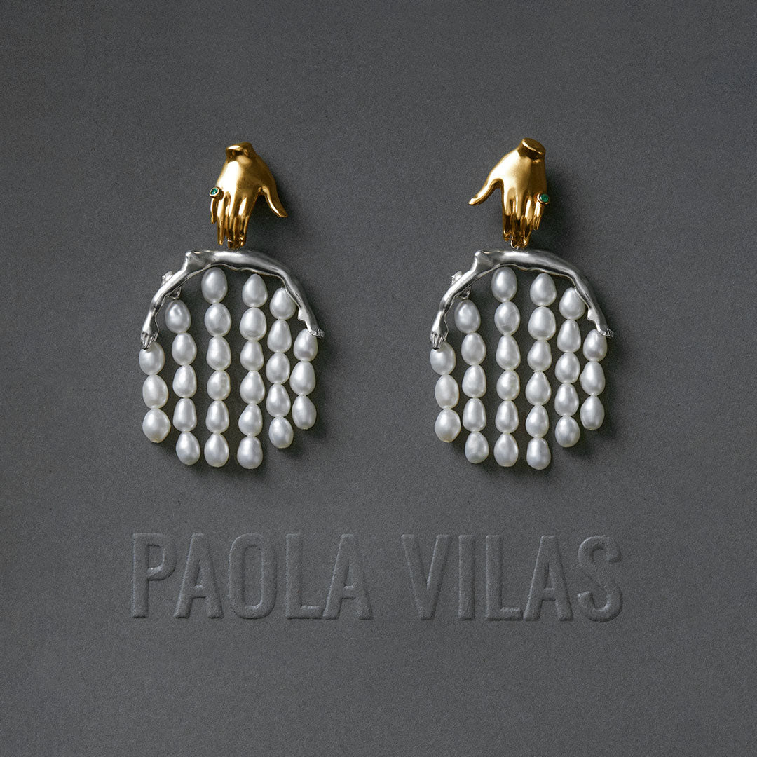 O Brinco Greta Paola Vilas é uma escultura vestível em Prata 925 ou Prata com banho de Ouro 18k, pérolas naturais e esmeralda. Uma joia que reverencia a força criativa do feminino, com formas orgânicas entrelaçadas a pérolas naturais, criando uma narrativa visual que transita entre o mistério e a delicadeza, o instinto e a transformação.