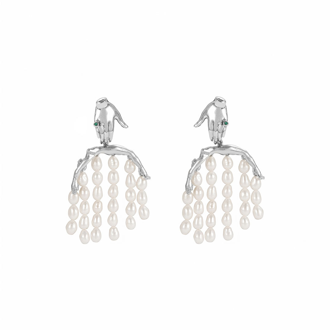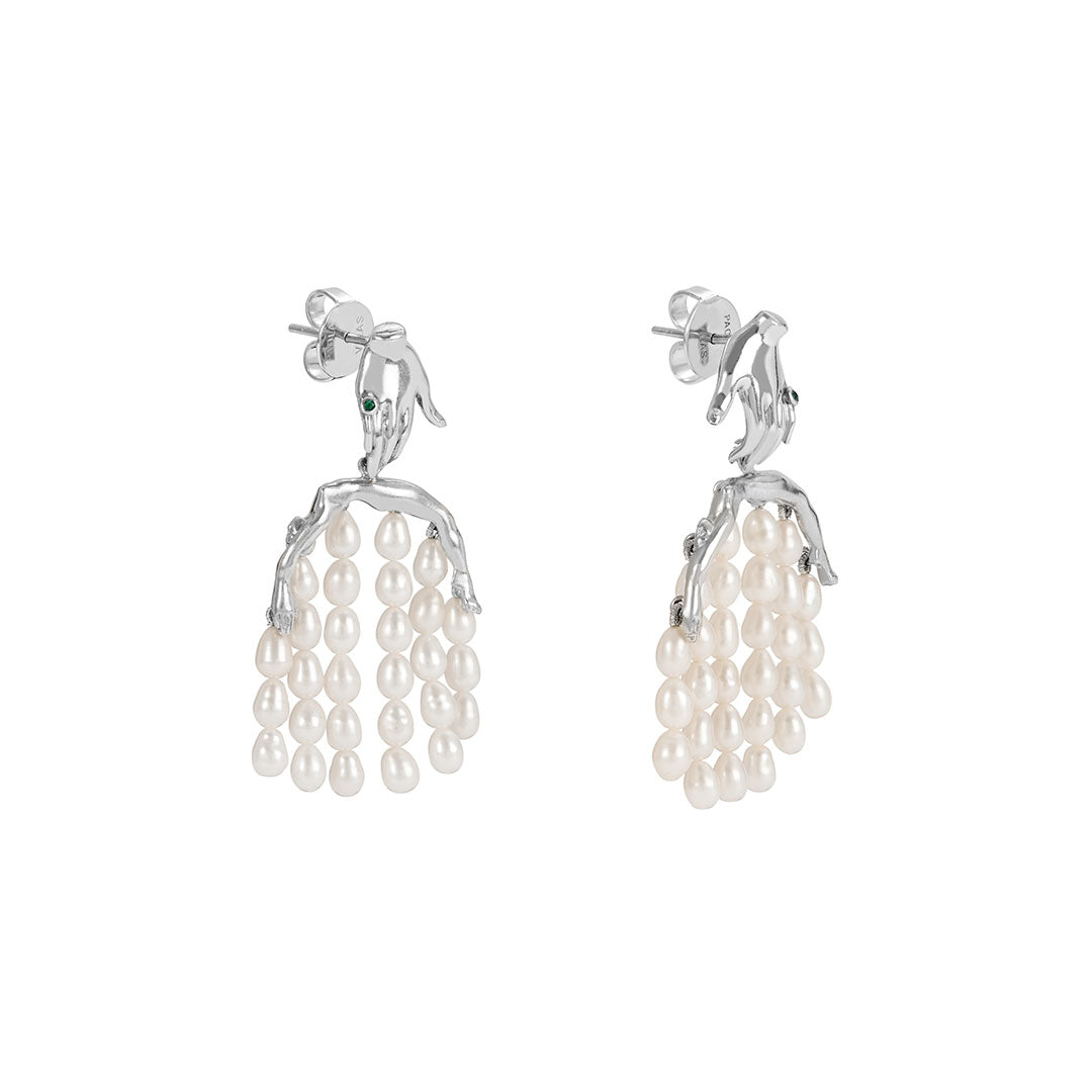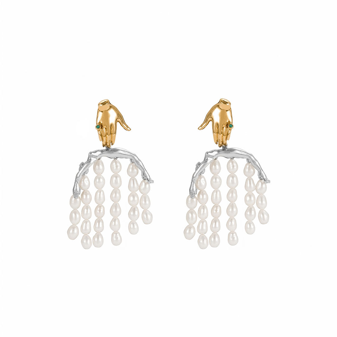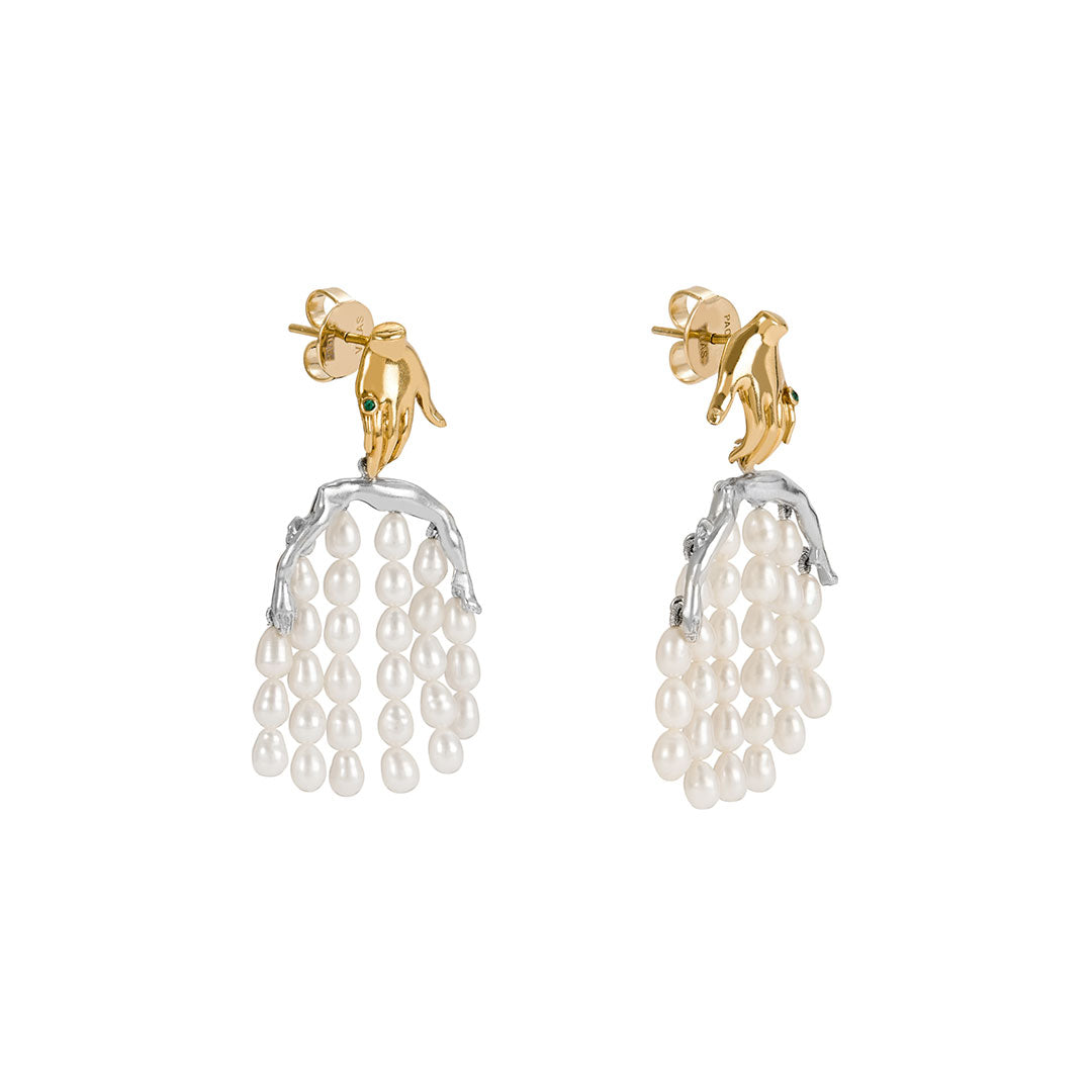 O Brinco Greta Paola Vilas é uma escultura vestível em Prata 925 ou Prata com banho de Ouro 18k, pérolas naturais e esmeralda. Uma joia que reverencia a força criativa do feminino, com formas orgânicas entrelaçadas a pérolas naturais, criando uma narrativa visual que transita entre o mistério e a delicadeza, o instinto e a transformação.