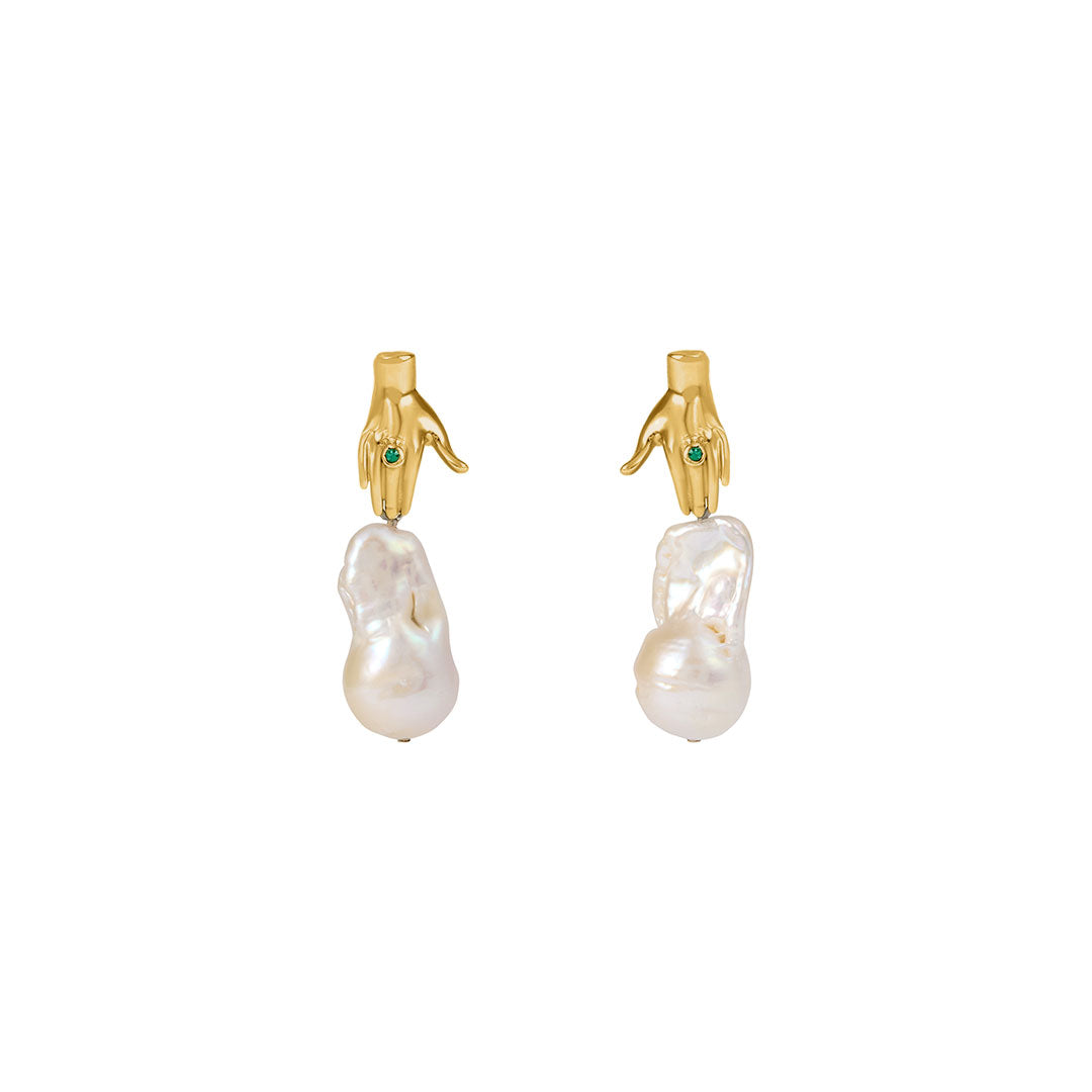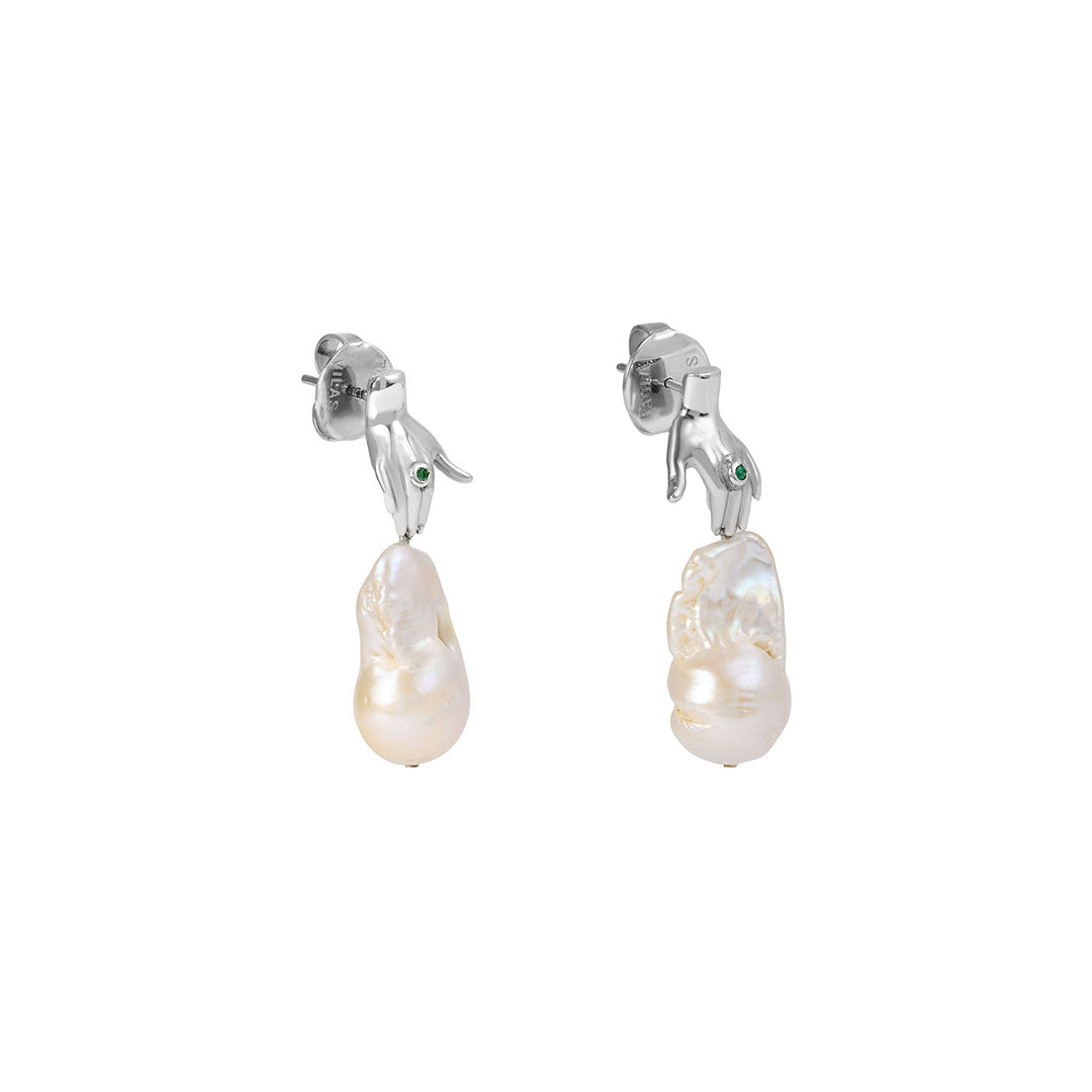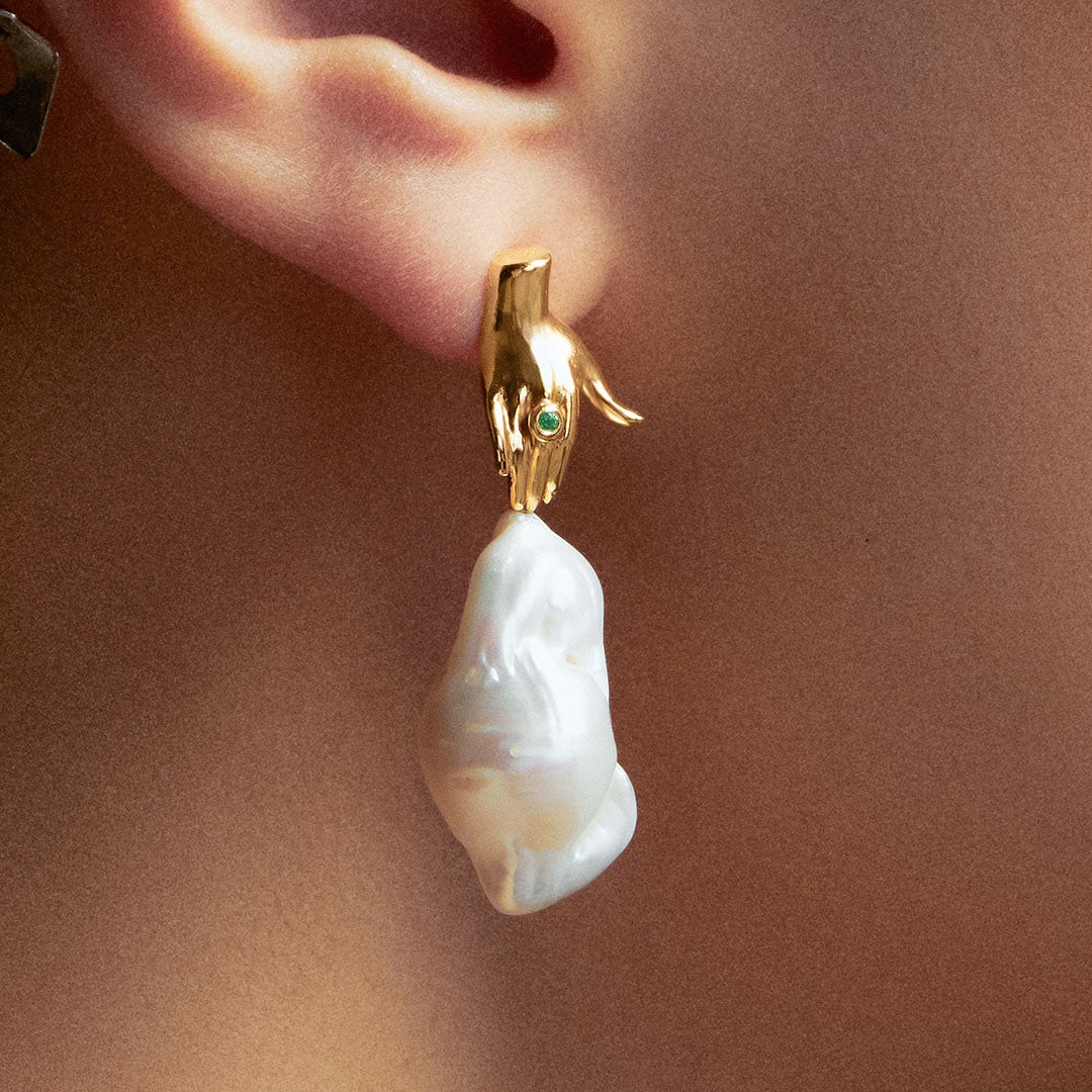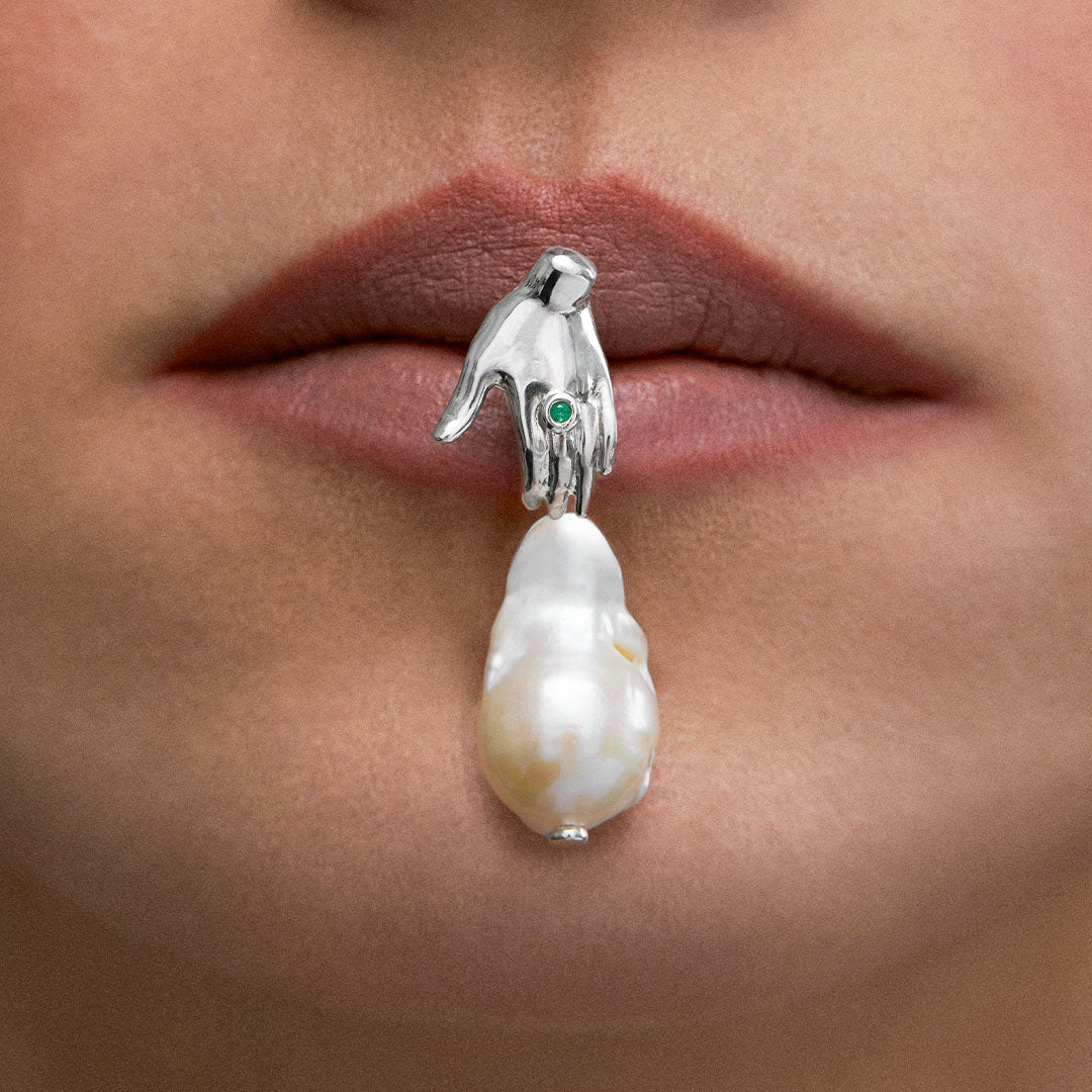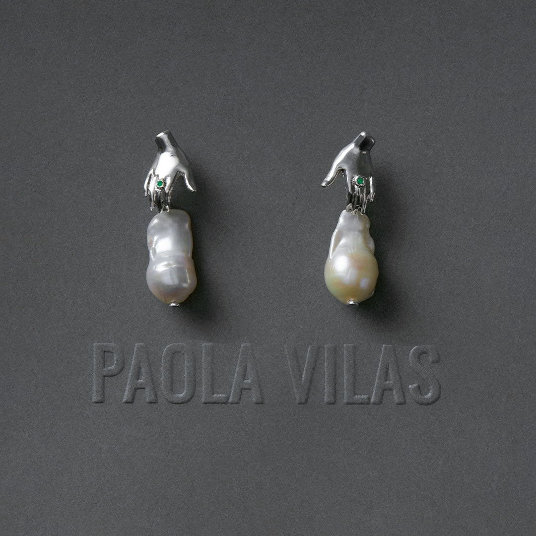 O Brinco Lisa Paola Vilas é uma escultura vestível em Prata 925 ou Prata com banho de Ouro 18k, pérolas naturais e esmeralda. Uma joia que reverencia a força criativa do feminino, com formas orgânicas entrelaçadas a pérolas naturais, criando uma narrativa visual que transita entre o mistério e a delicadeza, o instinto e a transformação.