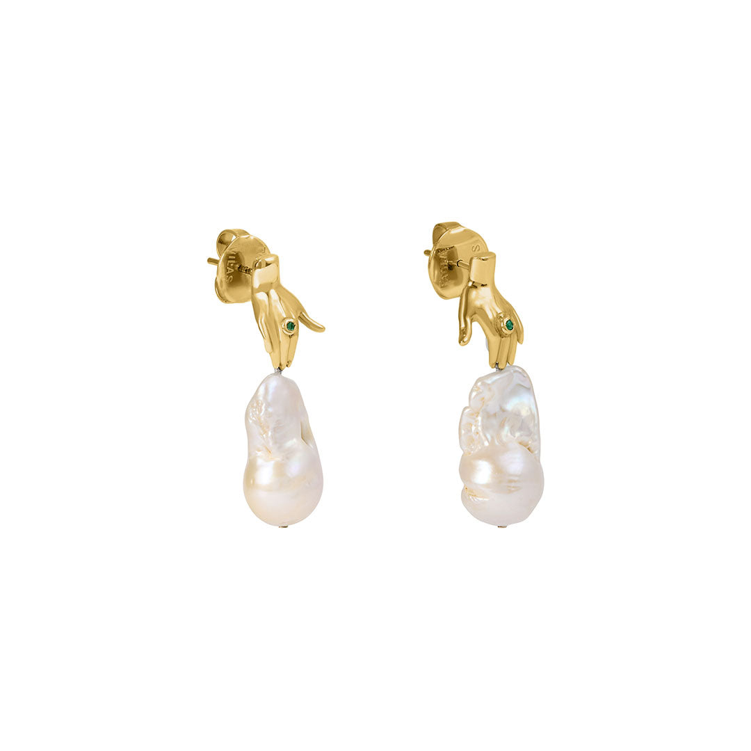 Material: Prata 925 ou Prata 925 com banho de Ouro 18k, pérolas naturais e esmeralda.