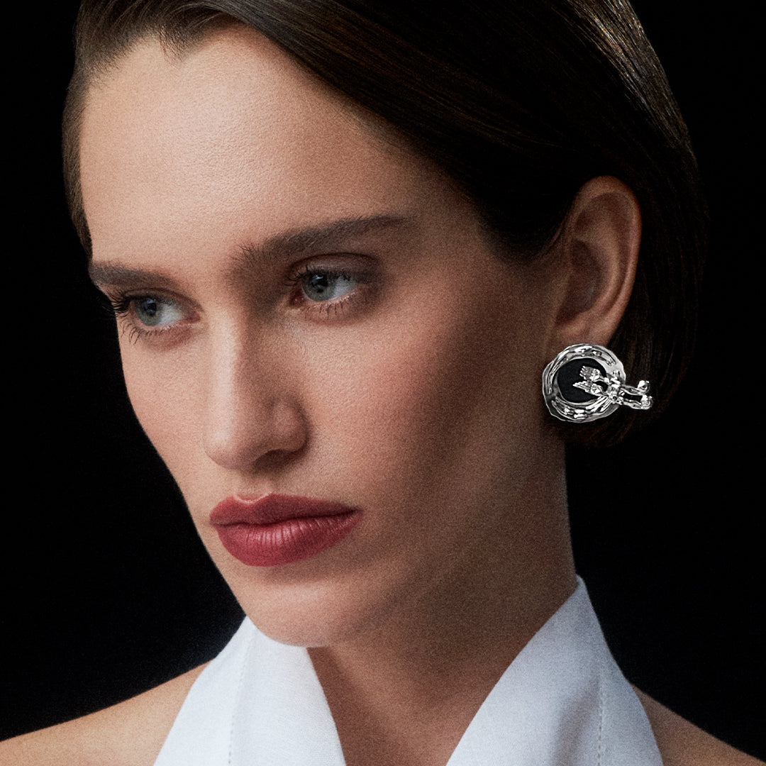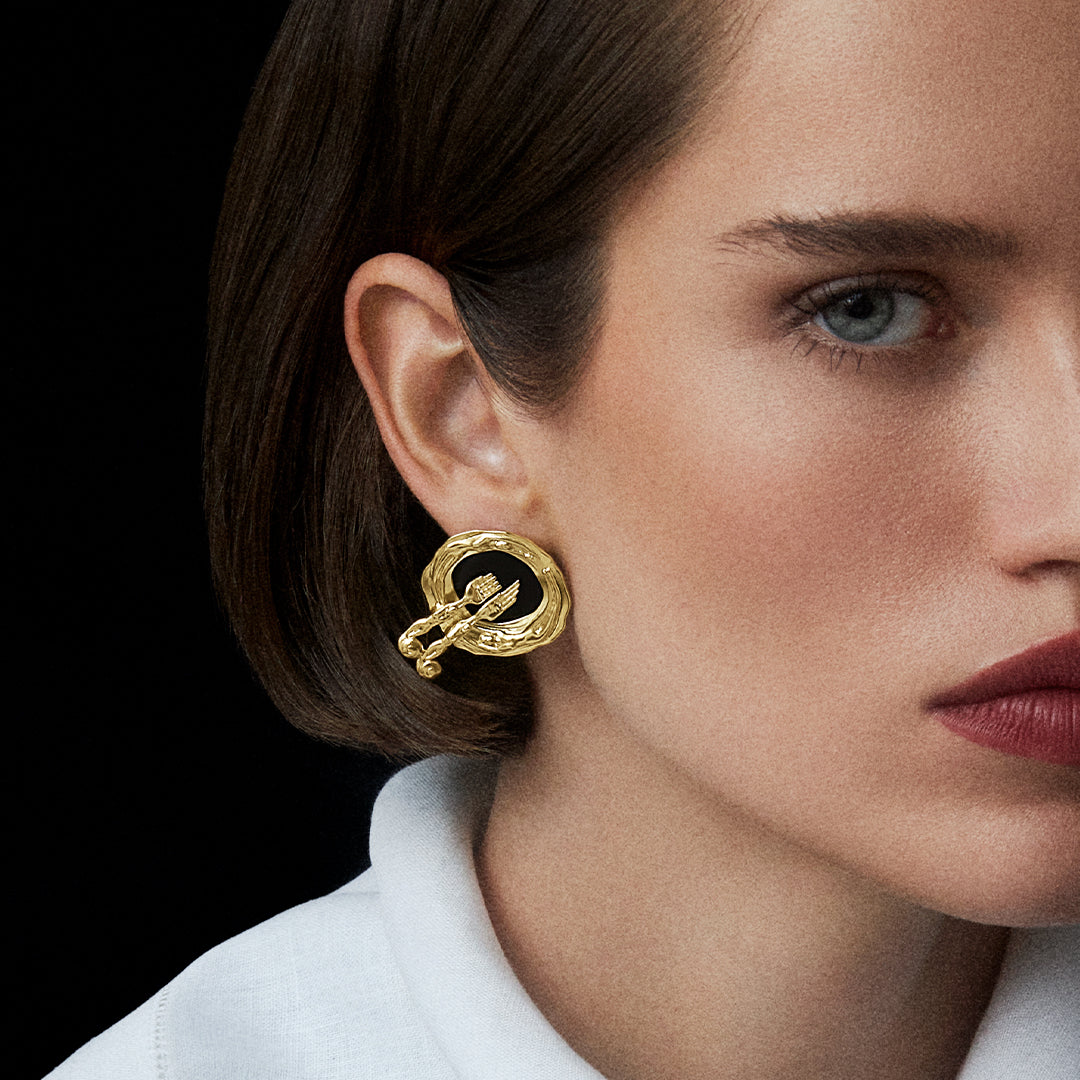 A Joia Paola Vilas Brinco Madalena é uma escultura vestível com formato de pratos e talheres feita em prata 925 ou prata 925 com banho de Ouro 18k.