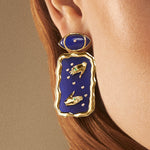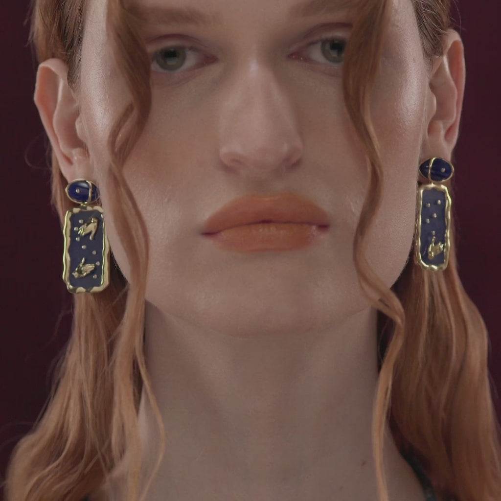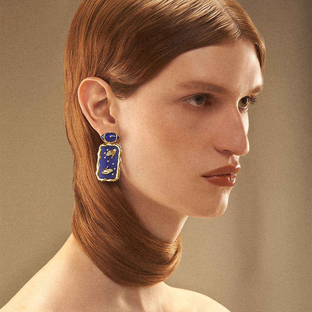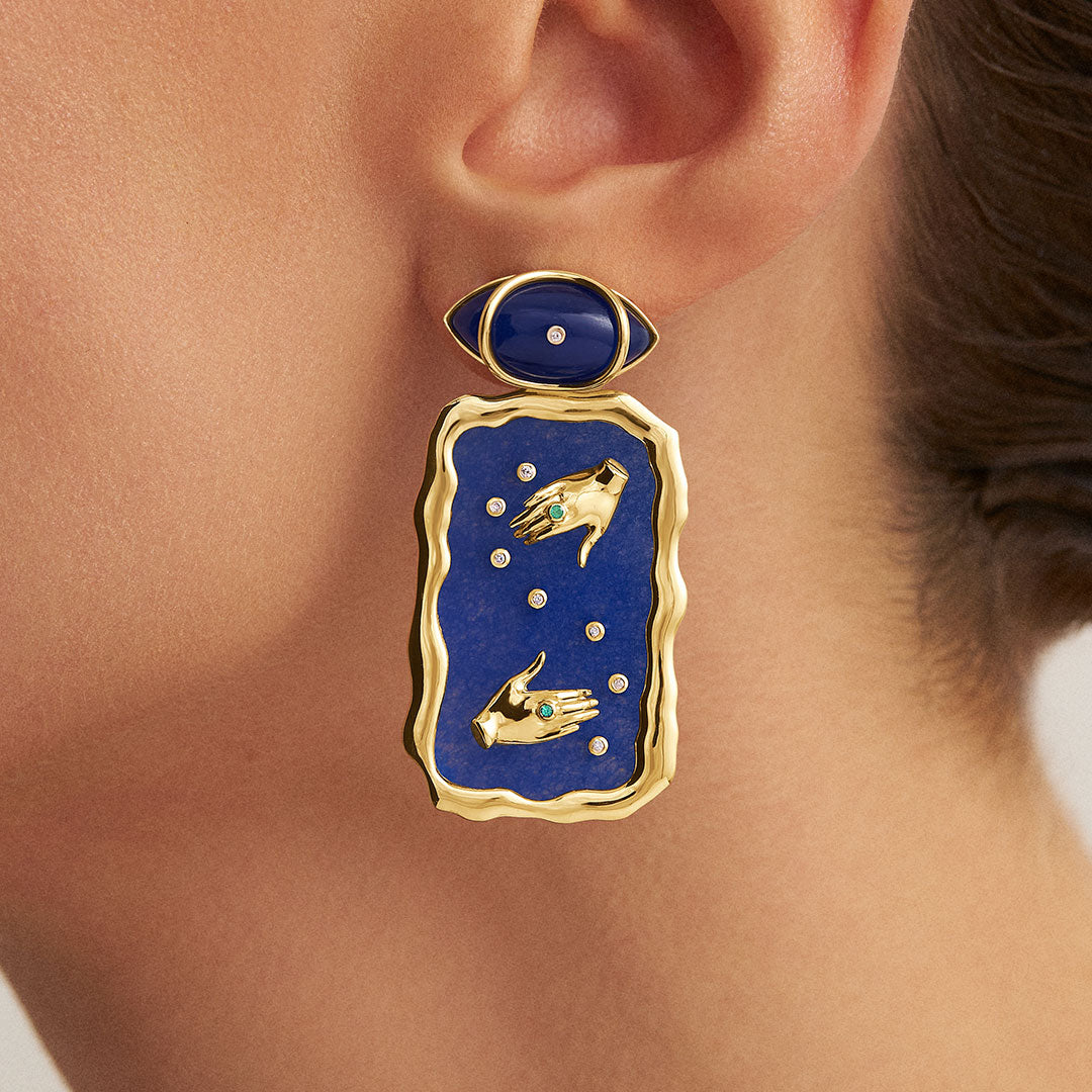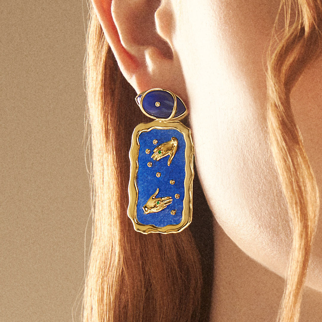 O Brinco Plêiades é uma joia Paola Vilas em Ouro 18k com rocha Jade Azul esculpida a mão, Diamantes e Esmeraldas.