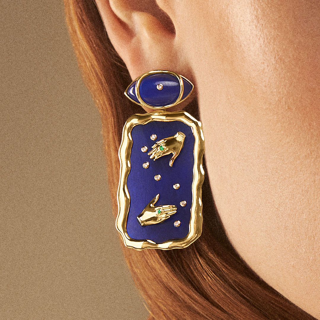 Assim como as mulheres se transformam, mãos transformam uma rocha bruta em um corpo com vida. A partir de uma técnica ancestral, seios de jade azul ganham vida em esculturas eternas com ouro e diamantes. Íris de olhos se manifestam no avesso de cada escultura, transformando cada peça em um amuleto.