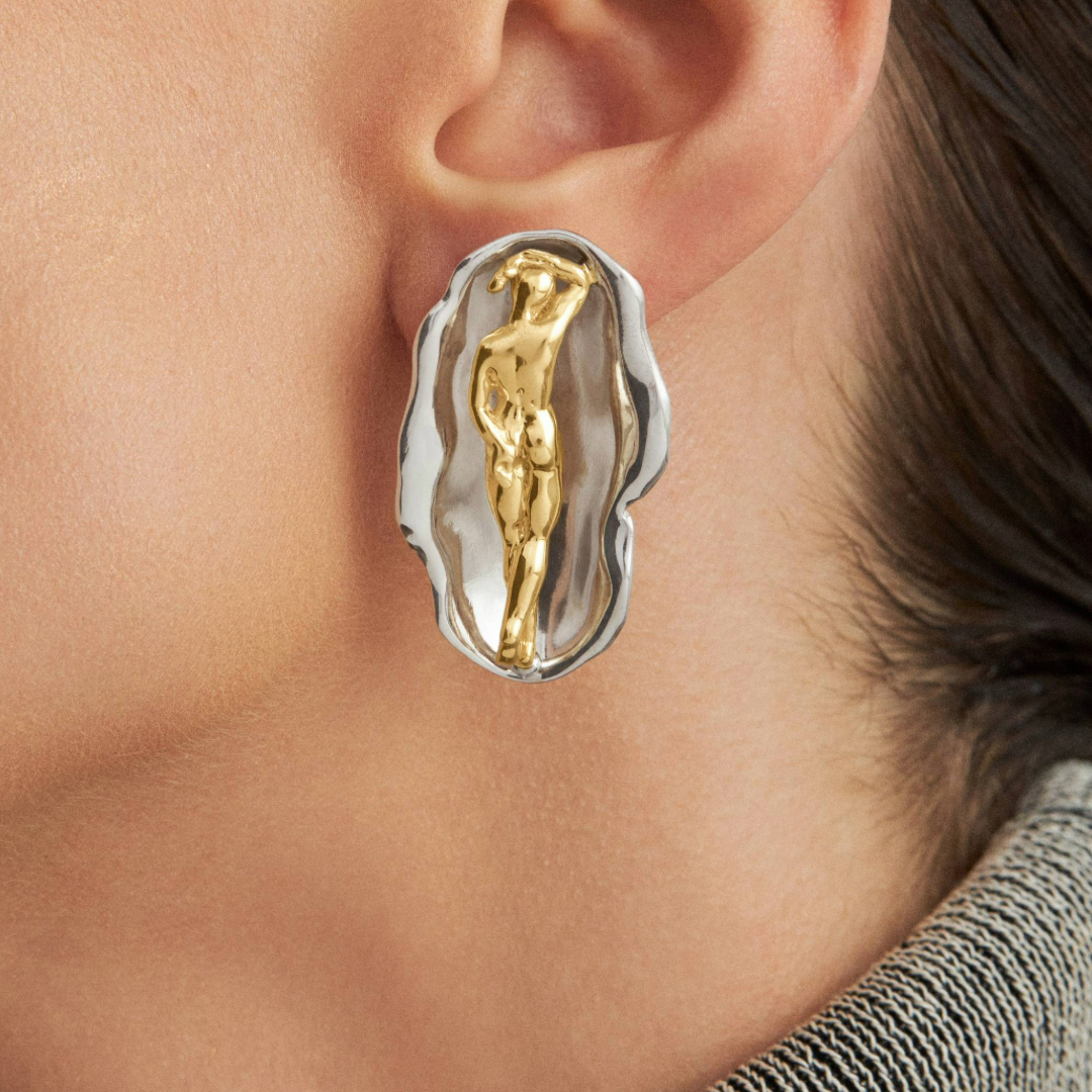 A Joia Paola Vilas brinco Vênus é uma escultura vestível em formato de concha e corpo feminino em prata com banho de ouro 18k.