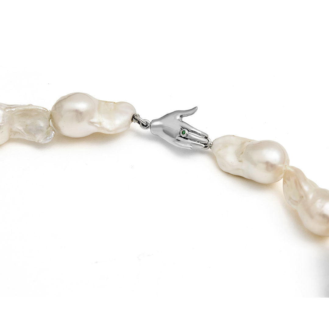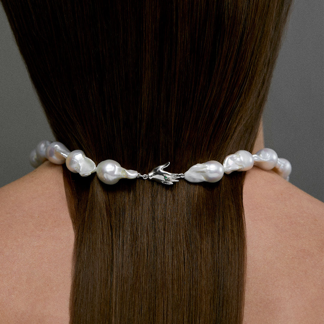 O Colar Lisa Paola Vilas é uma escultura vestível em Prata 925, pérolas e esmeralda. Uma joia que evoca a mão como símbolo universal de criação — a peça traz pérolas naturais que adicionam leveza e profundidade à narrativa da joia onde forma, gesto e matéria se entrelaçam.