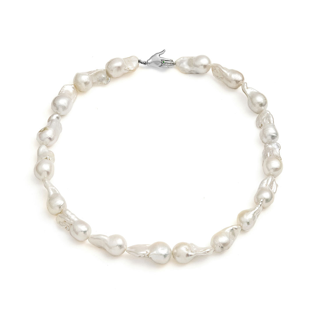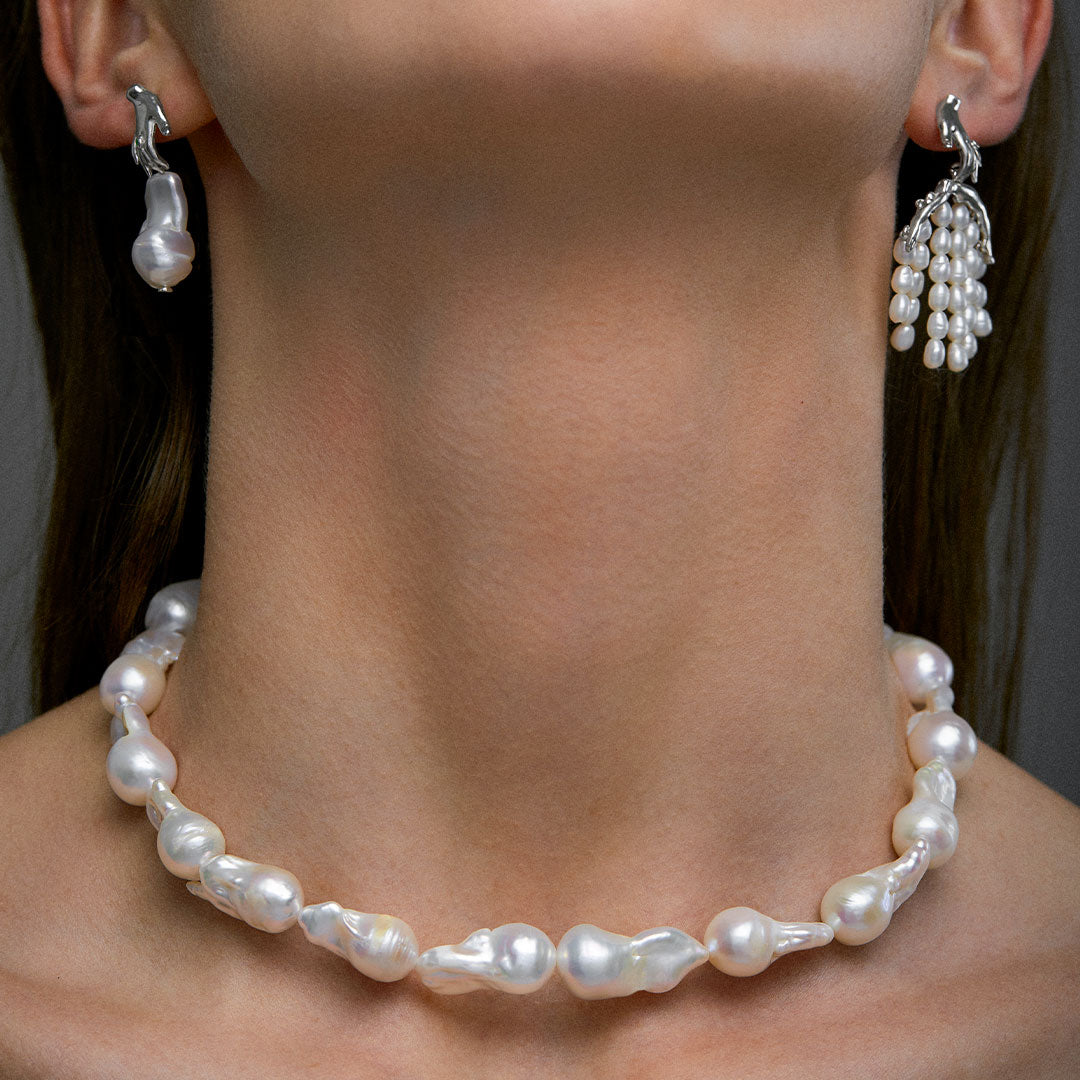 No Colar Lisa, formas orgânicas e pérolas naturais criam uma narrativa visual que transita entre o mistério e a delicadeza. A pérola — forjada na adversidade — e a mão — que molda e dá forma — se unem para representar a força do feminino: a capacidade de gerar e nutrir o novo.