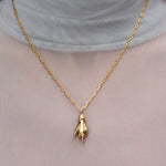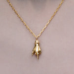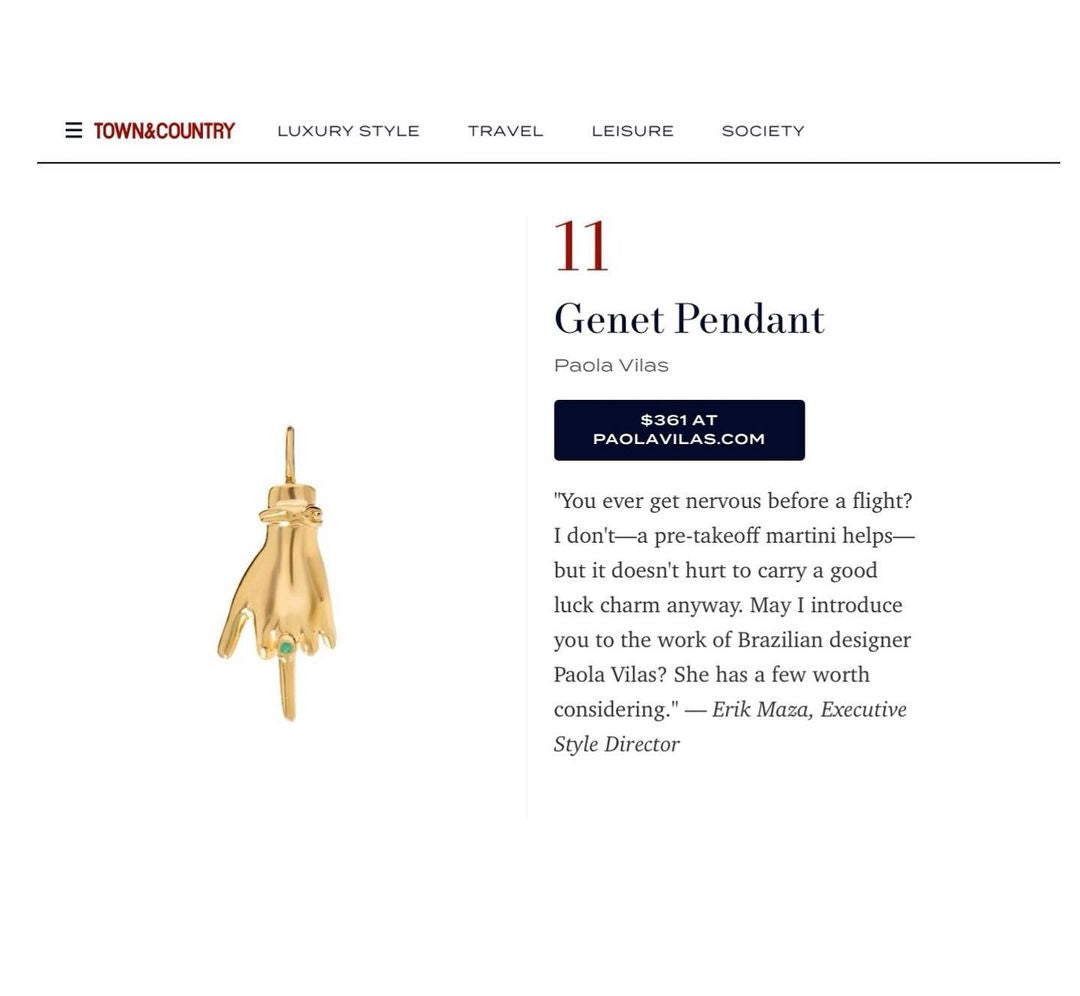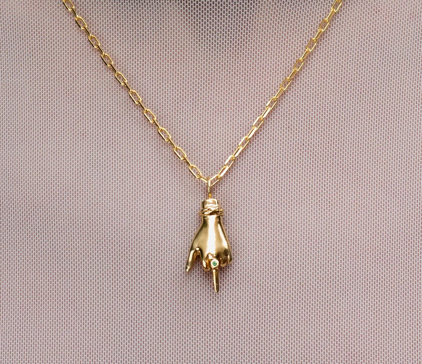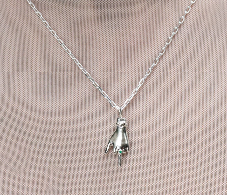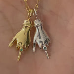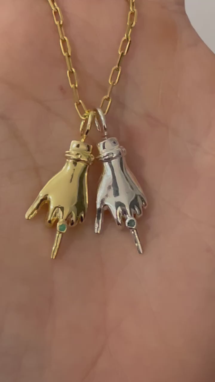 A Joia Paola Vilas pendente Genet é uma escultura vestível em formato de mãos em prata 925 ou prata com banho de ouro 18k com esmeralda natural. Uma de nossas joias icônicas.