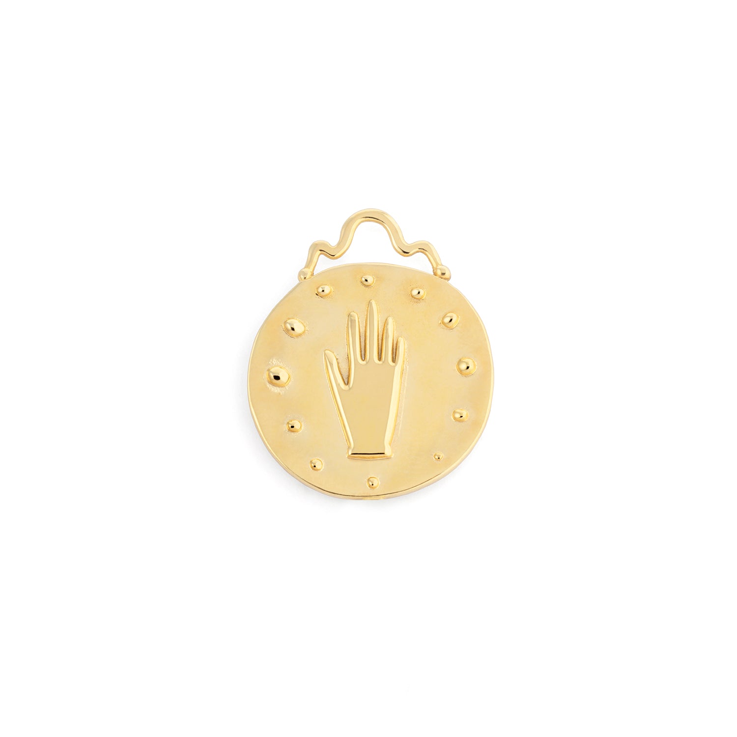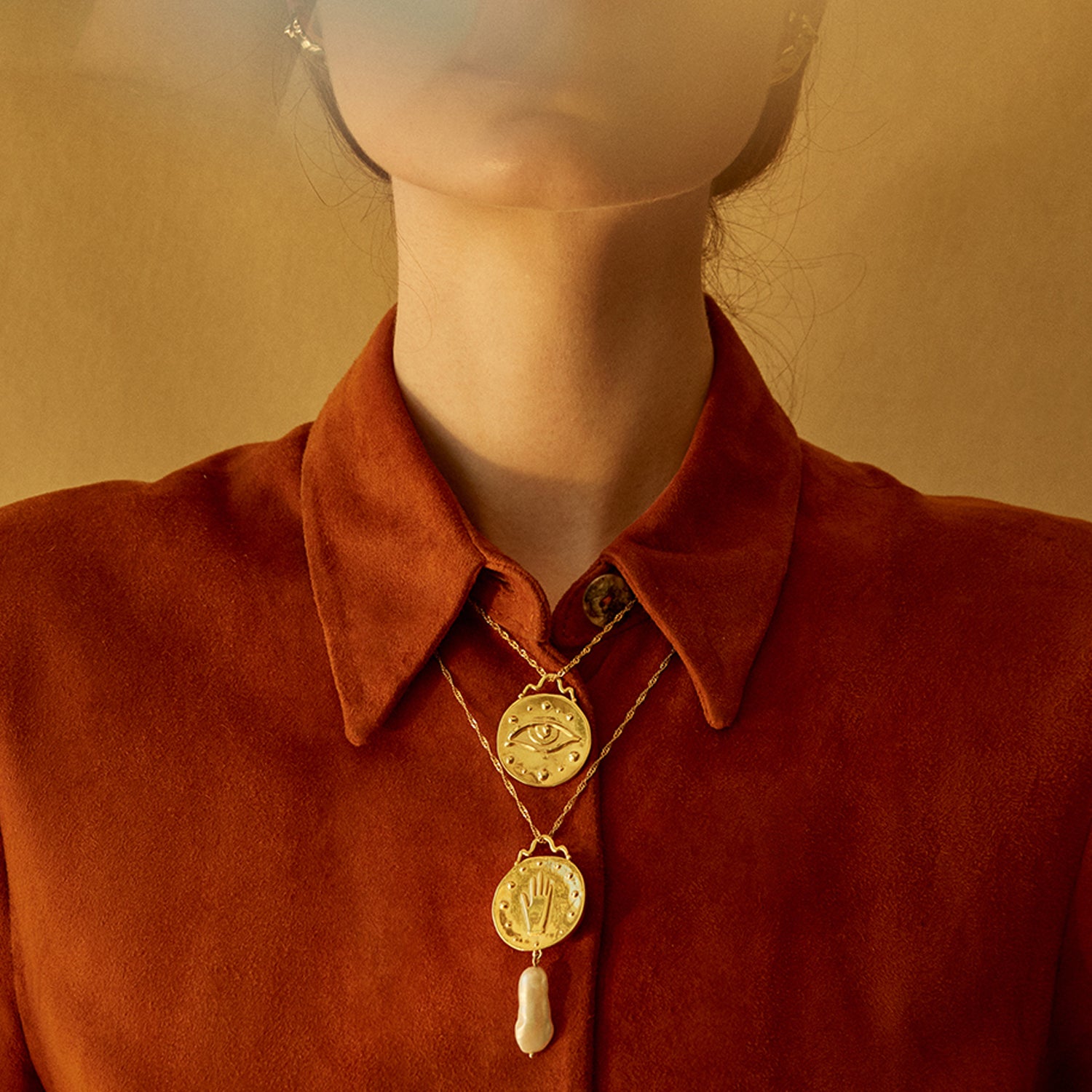 Em Germaine, são utilizados três símbolos para conferir à peça um sentido de talismã. Mão, olho e medalha são arquétipos de proteção e conexão com a espiritualidade.