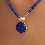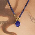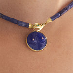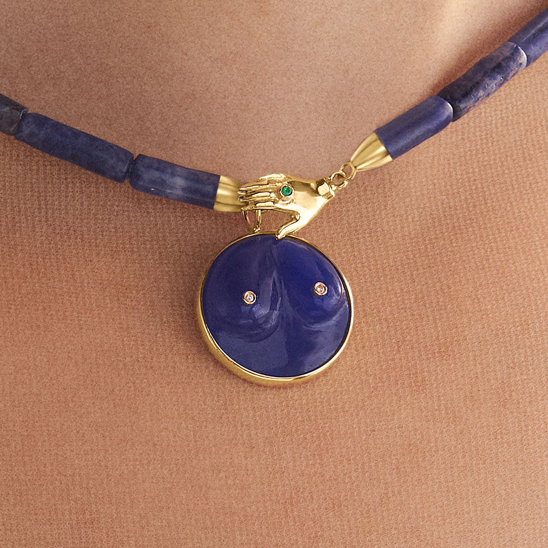 O Pendente Petra é uma joia Paola Vilas em Ouro 18k com rocha Jade Azul esculpida a mão e Diamantes, é uma escultura vestível em formato de busto com interior detalhado em forma de íris de olho.